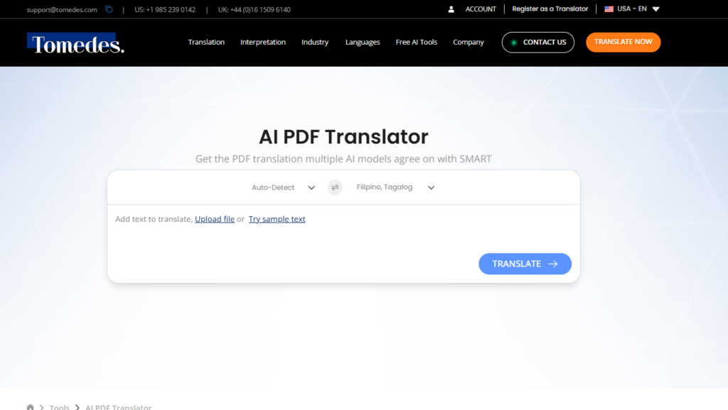 For professionals and global teams who require accurate multilingual PDF translation without losing formatting, Tomedes AI PDF Translator is a powerful AI-driven solution. It translates full PDF files into over 330 languages while preserving the original layout, including headings, tables, lists, multi-column pages, and structured formatting. This makes it especially useful for reports, manuals, research papers, contracts, and business documents.