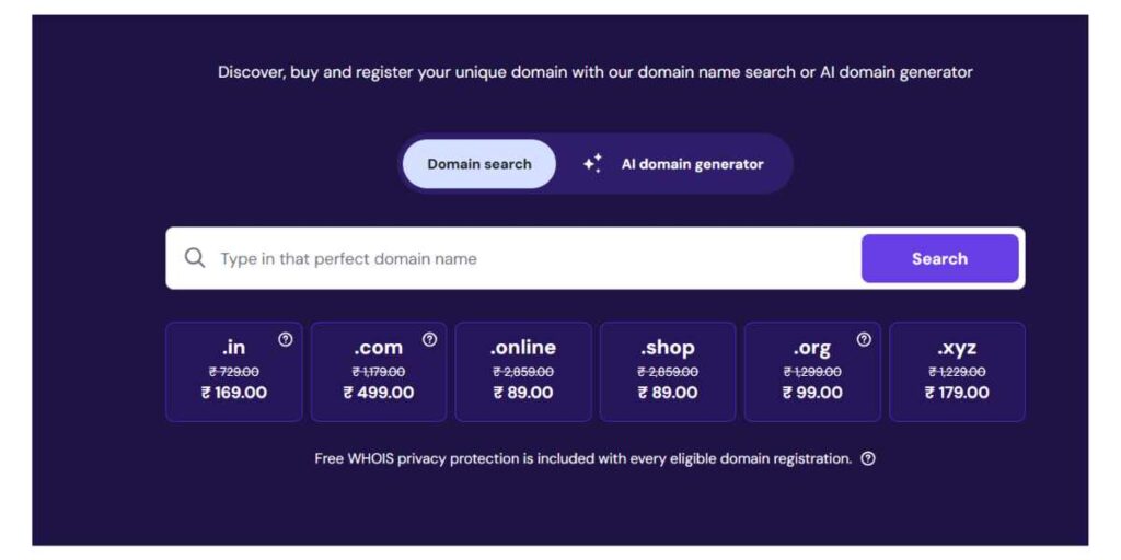 | Hostinger | ₹749 → ₹999 (with hosting) | On many TLDs | DNSSEC, Domain Lock | Live chat | 4/5 |