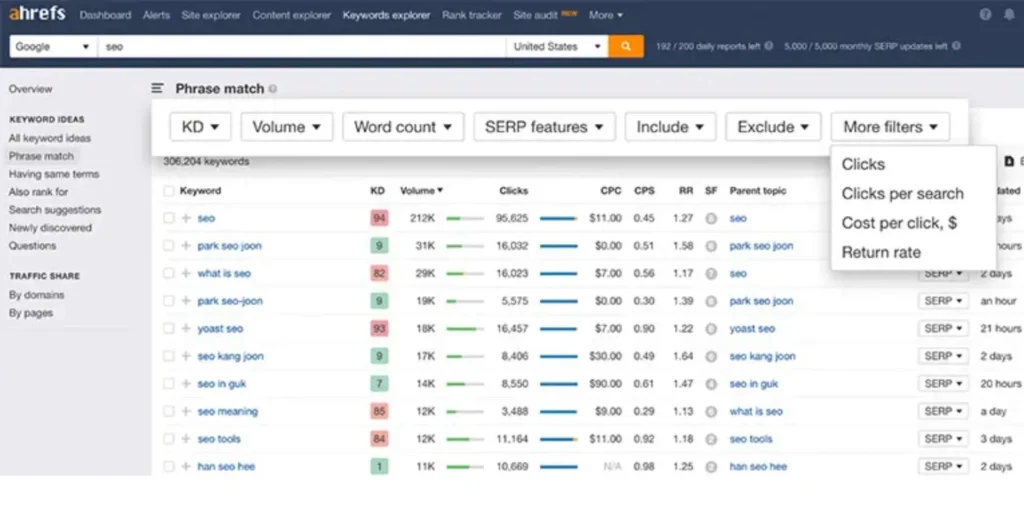 Ahrefs offers one of the largest keyword databases in the industry, with accurate search volumes, keyword difficulty scores, and search engine result tracking, all freely accessible and usable by anyone in the field.